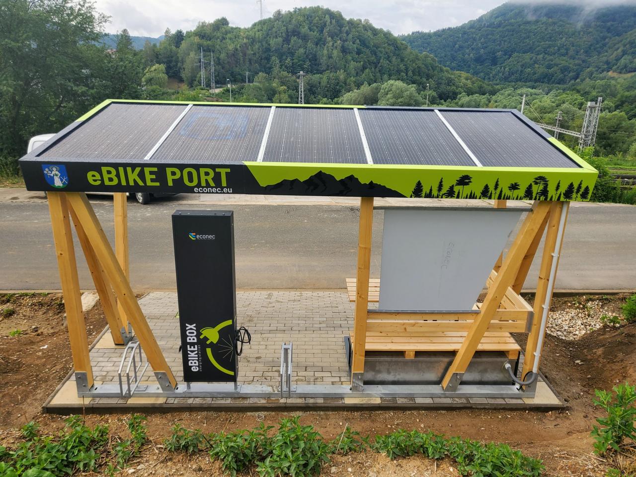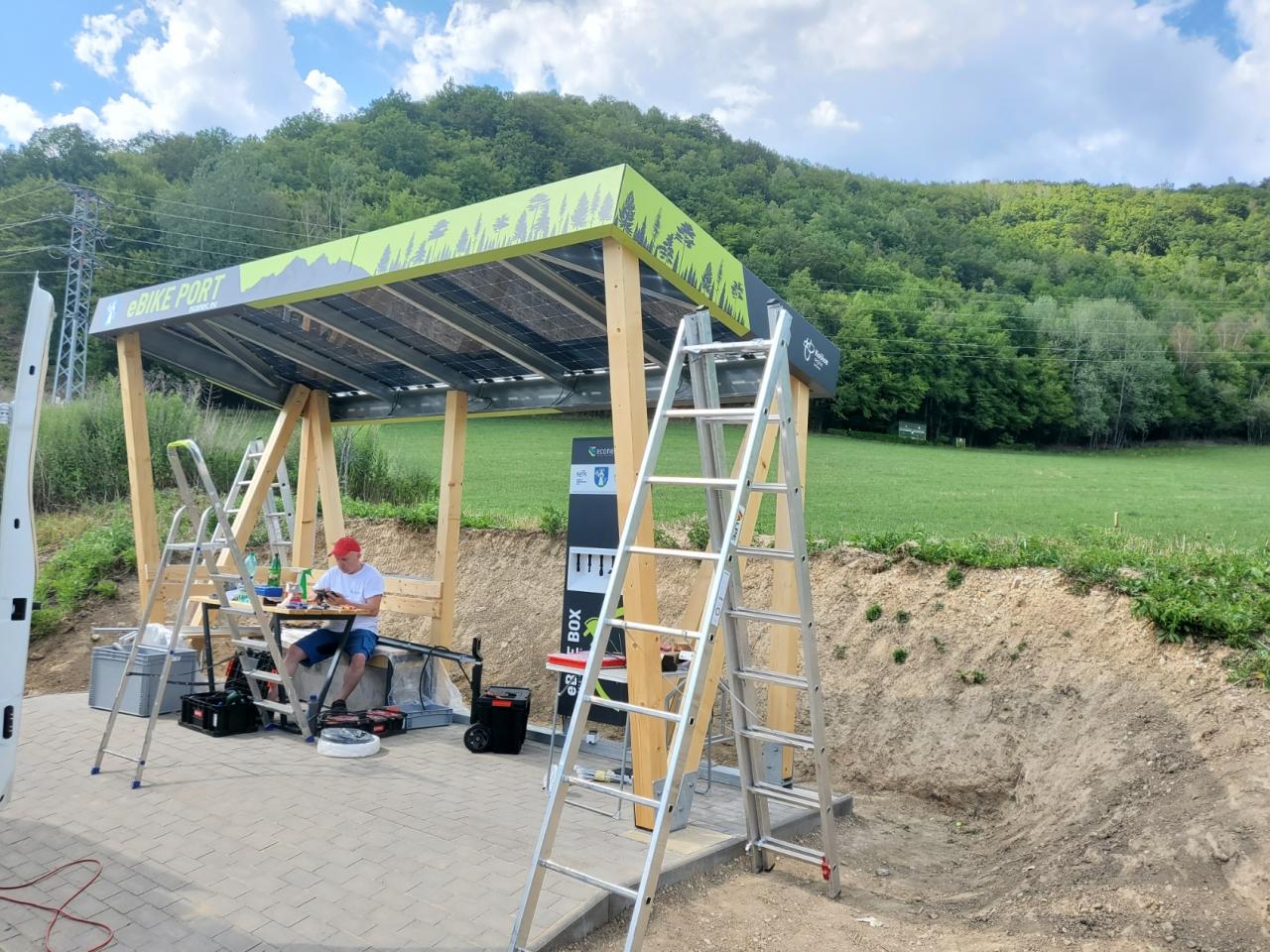 - osadenie moderného smart cykloprístrešku s fotovoltaickou strechou a nabíjačkou na