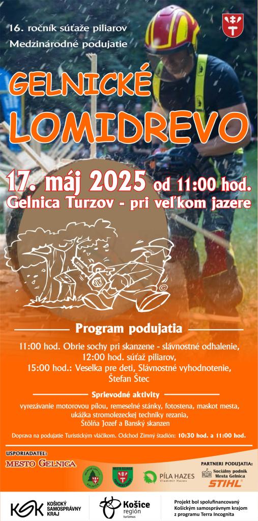 V mene primátora mesta Gelnica Ing. Dušana Tomaška, MBA Vás 17. mája 2025 srdečne pozývame na 16. ročník podujatia Gelnické lomidrevo. V malebnom prostredí gelnických lesov na Turzove privítame piliarov a rezbárov z Česka, Poľska, Maďarska a Slovenska. Tešiť sa môžete na napínavé súťažné disciplíny, zábavu pre deti, tradičné remeselné umenie nielen rezbárov a koncert populárneho speváka Štefana Šteca. Súčasťou podujatia bude odhalenie jedinečnej drevenej sochy baníka, ktorá sa stane súčasťou baníckeho areálu na Turzove. Počas podujatia môžete sfárať do Štôlne Jozef a navštíviť Banský skanzen na Turzove, alebo sa prejsť Náučným chodníkom Ríny. Doprava na podujatie bude zabezpečená Turistickým vláčikom.