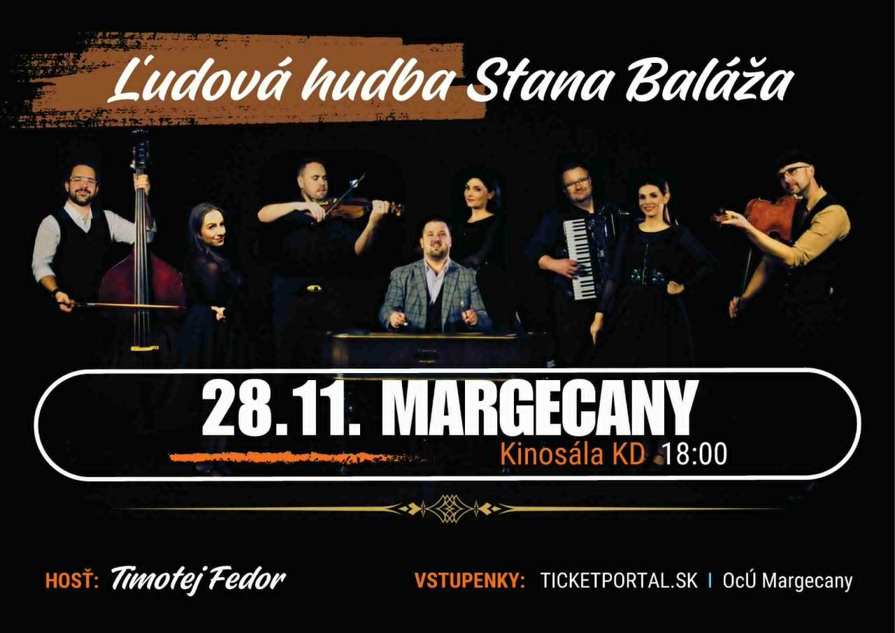 V KD Margecany 28.11.2025 o 18.00 h - Ľudová hudba Stana Baláža prichádza už tradične so skvelým repertoárom ľudových piesní na koncertné pódiá Východného Slovenska. Tentokrát to bude koncert, v ktorom má už niekoľko rokov svoje pevné miesto spevácke trio Krasotky a pribudli aj hosť: Timotej Fedor.
