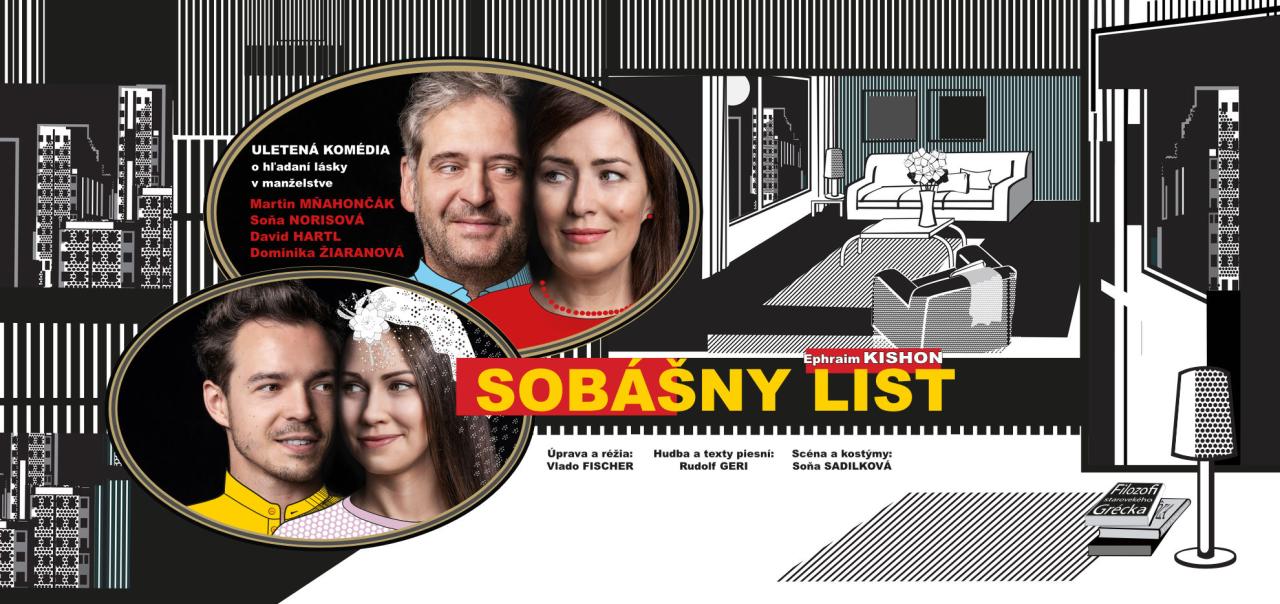 Divadelná hra "Sobášny list" v hereckom obsadení Mňahončák, Norisová, Hartl a Žiaranová. Vstupenky /22€/ na predpredaj.sk