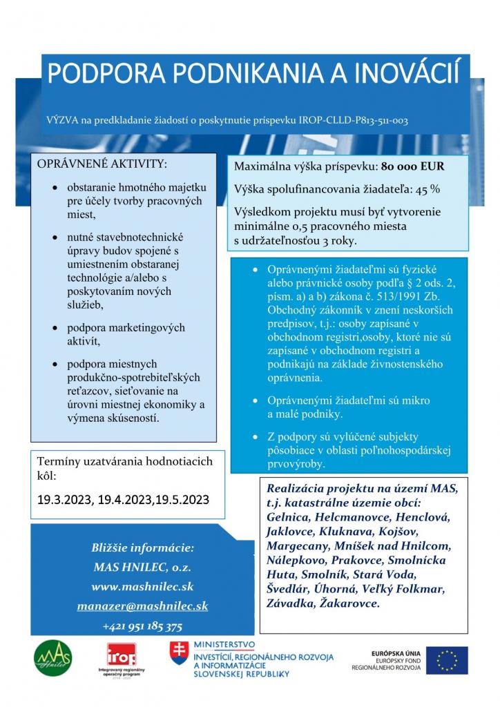 Výzva na predkladanie žiadostí o poskytnutie príspevku na podporu podnikania a inovácií v rámci MAS HNILEC.