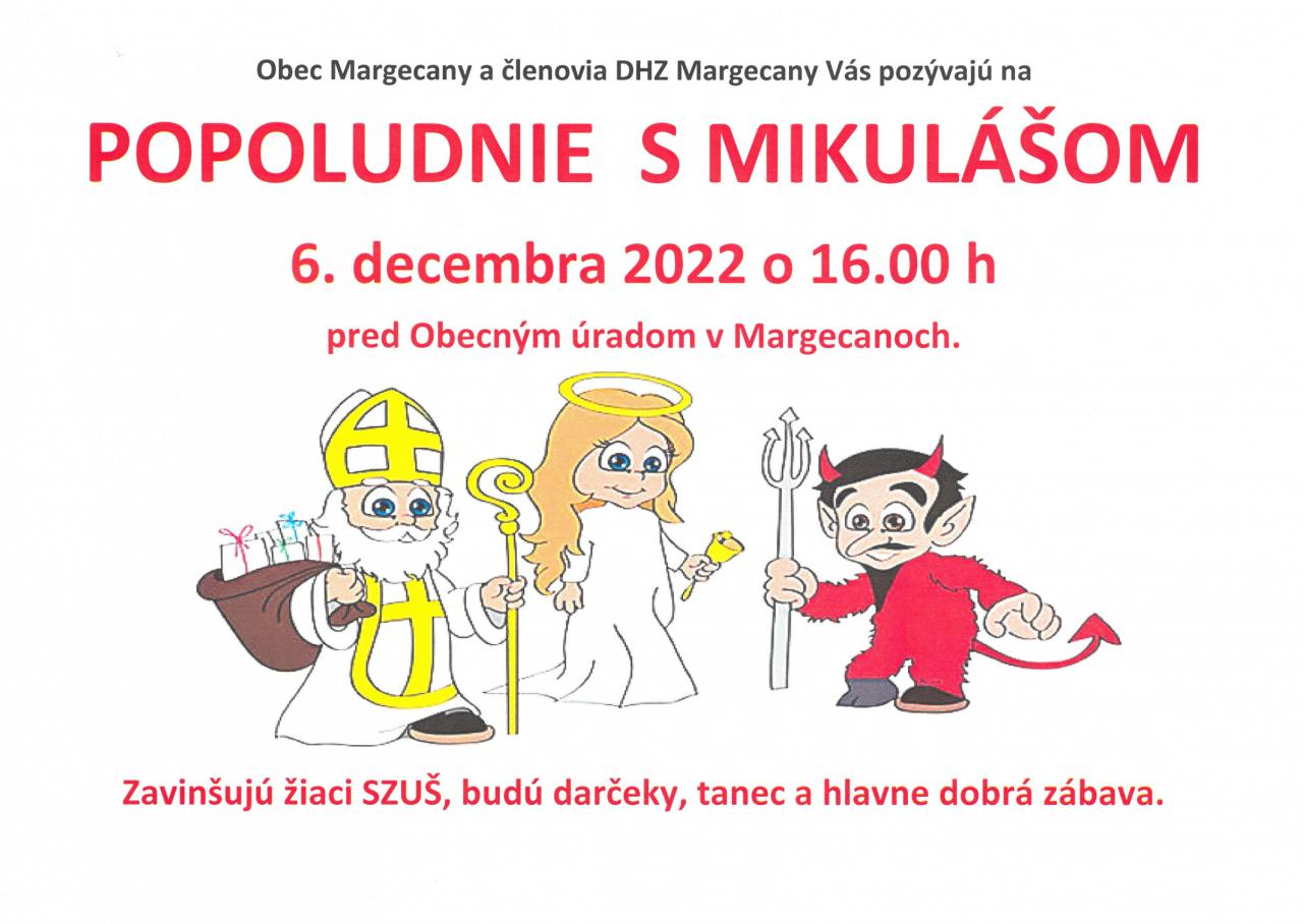 Pozývame malých aj veľkých na stretnutie s Mikulášom 6. 12. 2022 o 16.00 h pred obecný úrad v Margecanoch. Ak ste poslúchali, bude aj darček. Zaspievajú deti zo SZUŠ Margecany a v kinosále sa môžete vyblázniť do sýta pri rezkej hudbe a rôznych súťažiach.