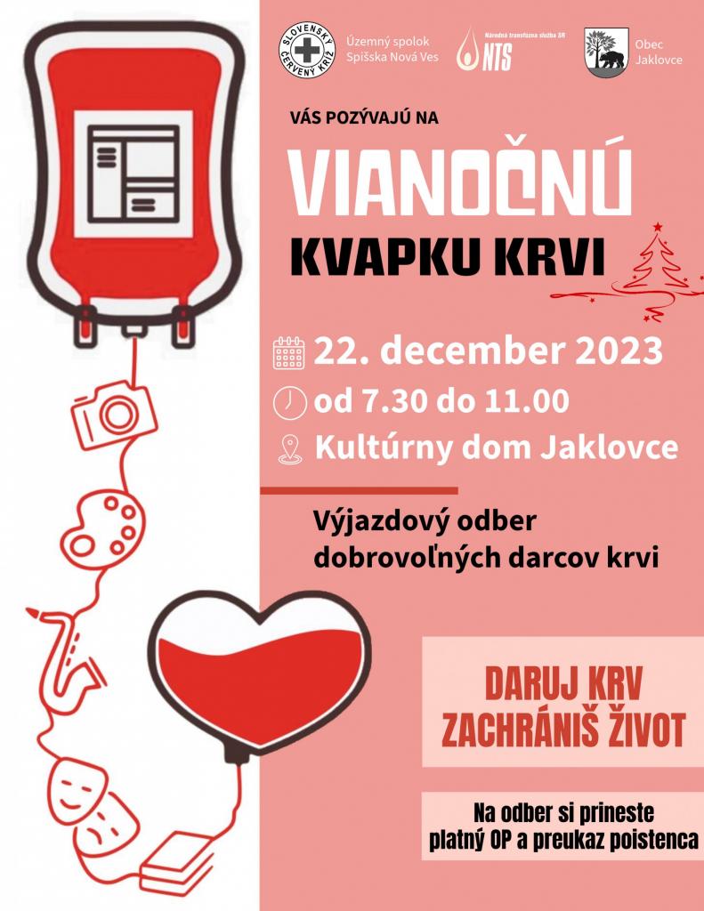 22.12.2023 od 7.30 h do 11.00 h v kultúrnom dome v Jaklovciach môžete darovať krv.