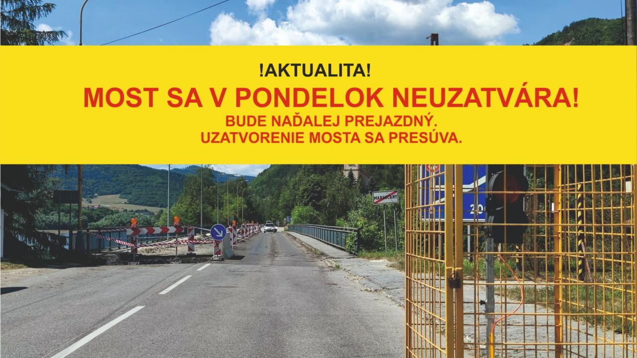 Na základe mimoriadneho oznámenia od zhotoviteľa stavby STRABAG z technických príčin a z dôvodu technologických postupov nebude v termíne od 18.07. – 22.07.2022 prebiehať avizovaná úplná uzávierka mosta na ceste II/546 pred obcou Margecany. Most bude naďalej prejazdný pre osobnú a nákladnú automobilovú dopravu s obmedzenou hmotnosťou. Spoje prímestskej dopravy budú premávať aj naďalej v štandardnom prázdninovom režime. O konkrétnom termíne budúcej plánovanej uzávierky a obmedzeniach v prímestskej doprave Vás budeme včas informovať.