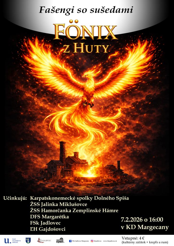 FSk Jadlovec Margecany vás srdečne pozýva na Podujatie Fašengi so sušedami s výnimočným scénickým programom s názvom Fonix z Huty. Príďte sa s nami vrátiť do čias, kedy oblohu nad Hornádom ožaroval oheň z pecí slávnej Phönixhütte a kedy sa v našich údoliach ozývala vrava nemeckých baníkov, talianskych barabov aj spev detí.
