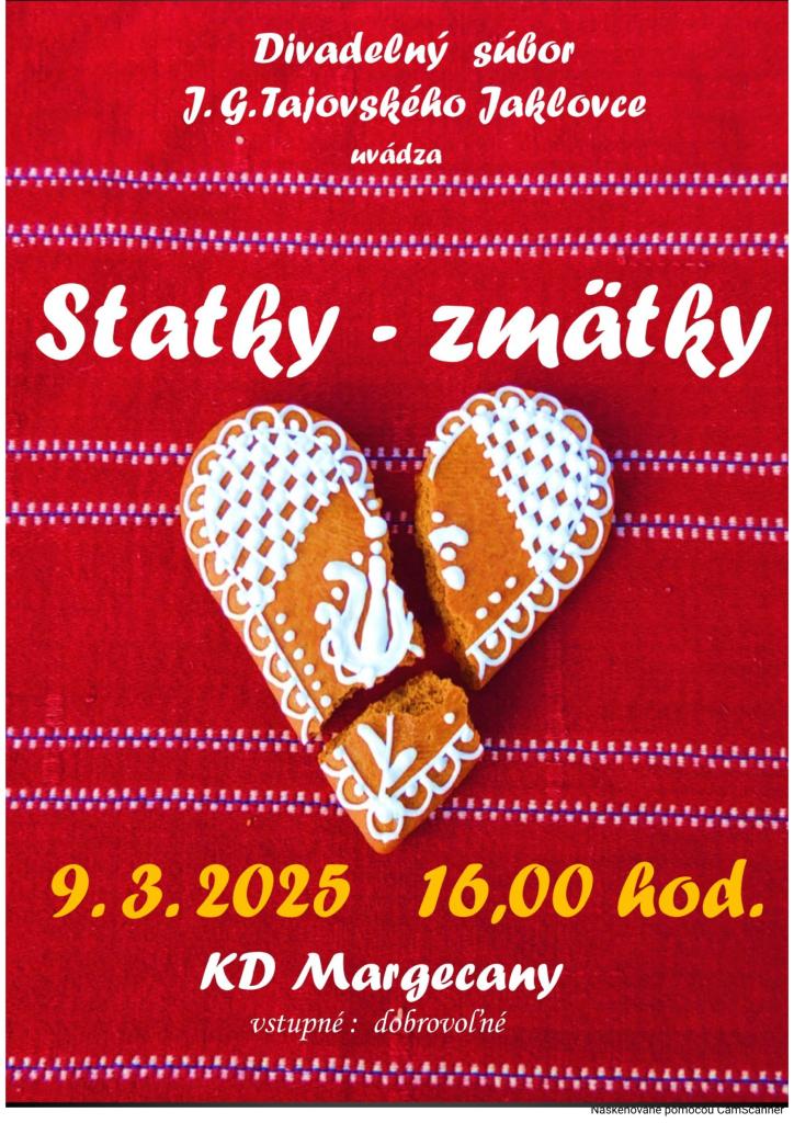 Divadelný súbor J. G. Tajovského Jaklovce Vás pozýva na divadelnú hru "Statky-zmätky, vstupné dobrovoľné.