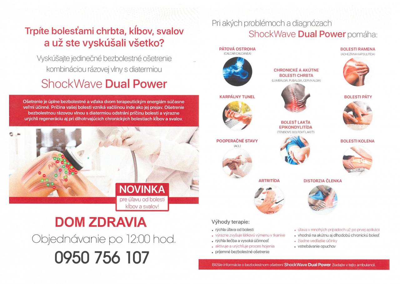Chirurgická ambulancia MUDr. Ivana Mráza v Gelnici poskytuje bezbolestnú terapiu, účinnú pri problémoch pohybového ústrojenstva, dlhotrvajúcich chronických bolestiach kĺbov a svalov a iných problémoch. Bližšie informácie na plagáte a na tel. č. 0950 756 107.