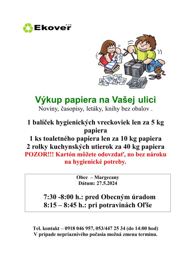 Firma Ekover uskutoční v našej obci výkup starého papiera 27.5.2024 o 7.30 h pred obecným úradom a o 8.15 h pri bývalých potravinách v Olše.