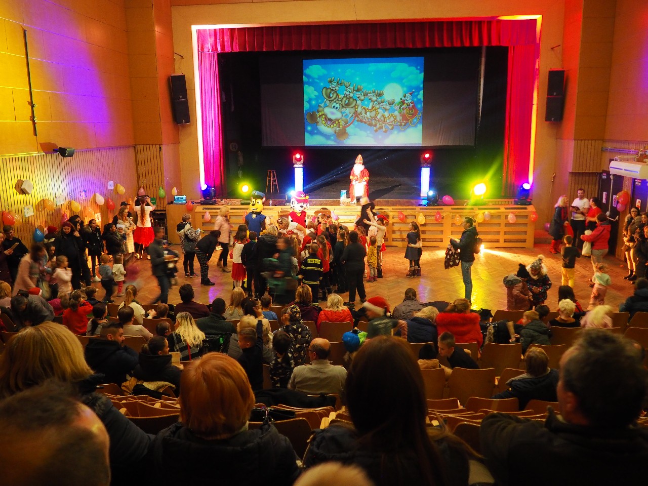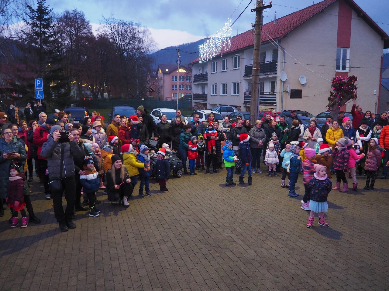 Privítanie Mikuláša deťmi, pred obecným úradom.