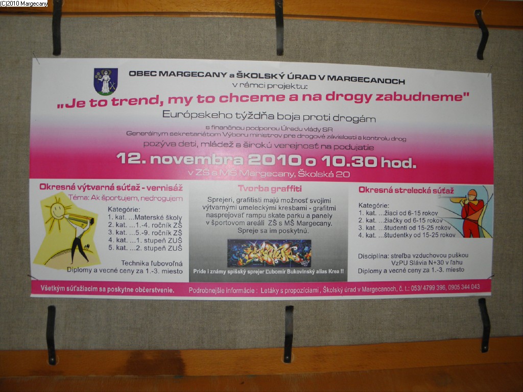 Druhý novembrový týždeň je vyhlásený za Európsky týždeň boja proti drogám. Práve preto obec Margecany, Spoločný školský úrad v Margecanoch uskutočnil 12. novembra 2010 aktivity z projektu „Je to trend, my to chceme a na drogy zabudneme“, ktorý bol finančne podporený z Úradu vlády SR, Generálneho sekretariátu Výboru ministrov pre drogové závislosti a kontrolu drog. Cieľom projektu a teda i obce a školy je vytvárať vhodné podmienky a prostredie pre deti a mládež, ponúknuť im širokú škálu záujmovej činnosti, aby zmysluplne trávili voľný čas. A to je vlastne i prevencia pred sociálno-patologickými javmi. Chceli sme a chceme dať možnosť mladým „umelcom“, sprejerom, grafiťákom sa prezentovať, pretože ich výtvarný prejav je vnímaný ako negatívny jav, vandalizmus a to z pohľadu „osprejovaných“ budov. My chceme tomu predísť a vytvorili sme priestor, kde sprejeri majú možnosť inovatívnou formou umeleckého prejavu – graffiti skrášliť a esteticky dotvoriť päť panelov a skaterampu v športovom areáli základnej školy. Pozvali sme i známych umeleckých writerov ako Ľubomíra Bukovinského alias Kreo, Martina Bdžocha, Miriamu Bukšárovú, ale dali sme možnosť i žiakom zo základných škôl nášho okresu. K dispozícií mali zadarmo spreje. Opravený skatepark tak ponúka v estetickom peknom prostredí možnosti nielen pre grafiťákov, ale i pre trendový šport skateboarding. Ďalšou aktivitou bola okresná výtvarná súťaž pre deti materských, základných a základných umeleckých škôl. Deti kreslili, maľovali na tému „Ak športujem, nedrogujem“. Práce detí boli vystavené vo vstupnej hale tunajšej základnej školy a najkrajšie práce boli ocenené diplomami a vecnými cenami. Zámerom projektu je upriamiť pozornosť detí a mládeže na málo rozšírený šport, ktorý má ale v Margecanoch tradíciu, a to streľbu zo vzduchových zbraní. ZŠ s MŠ v Margecanoch má ojedinelé zameranie školy v širokom okolí, lebo tu pôsobí Školské stredisko Záujmovej činnosti mládeže v športovej streľbe, ktoré dosahuje veľmi pekné úspechy i v rámci Slovenska. Zakúpením pištole, brokov, terčov a okresnou streleckou súťažou sme chceli a chceme pritiahnuť k tomuto športu viac mládeže. Víťazi dostali diplomy, vecné ceny. Všetci súťažiaci dostali občerstvenie, a to bagety, džúsy a keksy. Nálada bola výborná, lebo súťažiacim vyhrávala hudba. Veríme, že sme vytvorili dobré podmienky pre záujmovú činnosť detí a mládeže, pre to, čo ich baví, čo je moderné, trend a tak naplnili názov a cieľ projektu. Mgr. Ľ. Mikolajová, ŠÚ Margecany, autorka projektu 1 2 ... 5 ► Zaujalo vás to? Zdieľajte:
